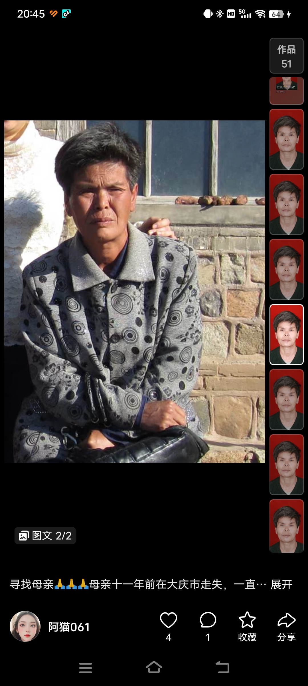 正文 失踪人员:杨凤金 admin V管理员 /03-17/1.14 W阅读/0评论 0317 失踪人员:杨凤金 (寻亲网编号:10633) 基本信息: 姓 名:杨凤金 性 别:女性 出生日期:195012 失踪日期:2012 失踪地点:黑龙江省大庆市 失踪时身高:160 联系方式:13504593723 详细介绍: 偏瘦,有精神问题 信息图片: 寻人启事资料、照片等均由用户提供,如侵犯任何第三人肖像权、隐私权或其他合法权益,请联系本站删除!